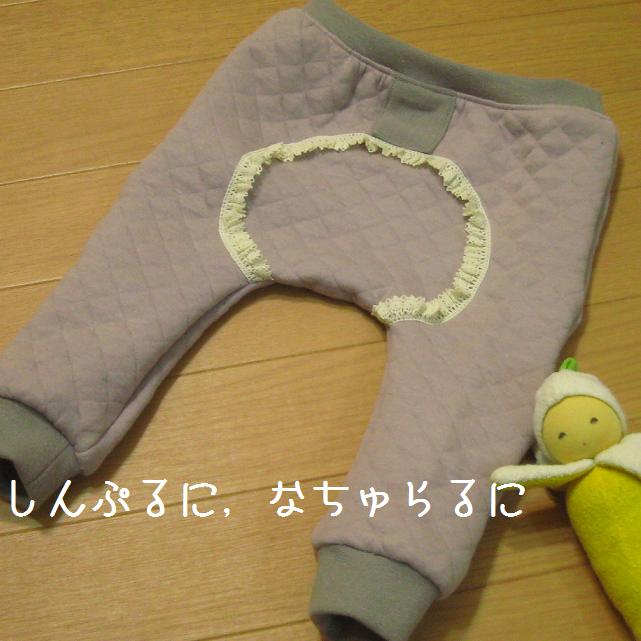 ボーっとして輪にする方を間違えて裁断してしまい,おしり側の布が真ん中でまっぷたつ.仕方ないのでつぎあわせてごまかしました.レースもつけて,結果オーライ?