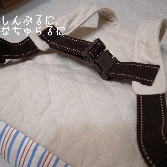 でもでも!前面・マチ・背面の3パーツを合わせる時になり,輪にしたマチ部分が明らかに小さいことが発覚!裁断を間違えたかと慌てて確認したのですが・・・,本が間違っていませんか!?それとも私の読み取り力不足!?底部分を切って布を足して,なんとかできました.肩ひもの付け方や胸元のバックルなど,一部アレンジしています.